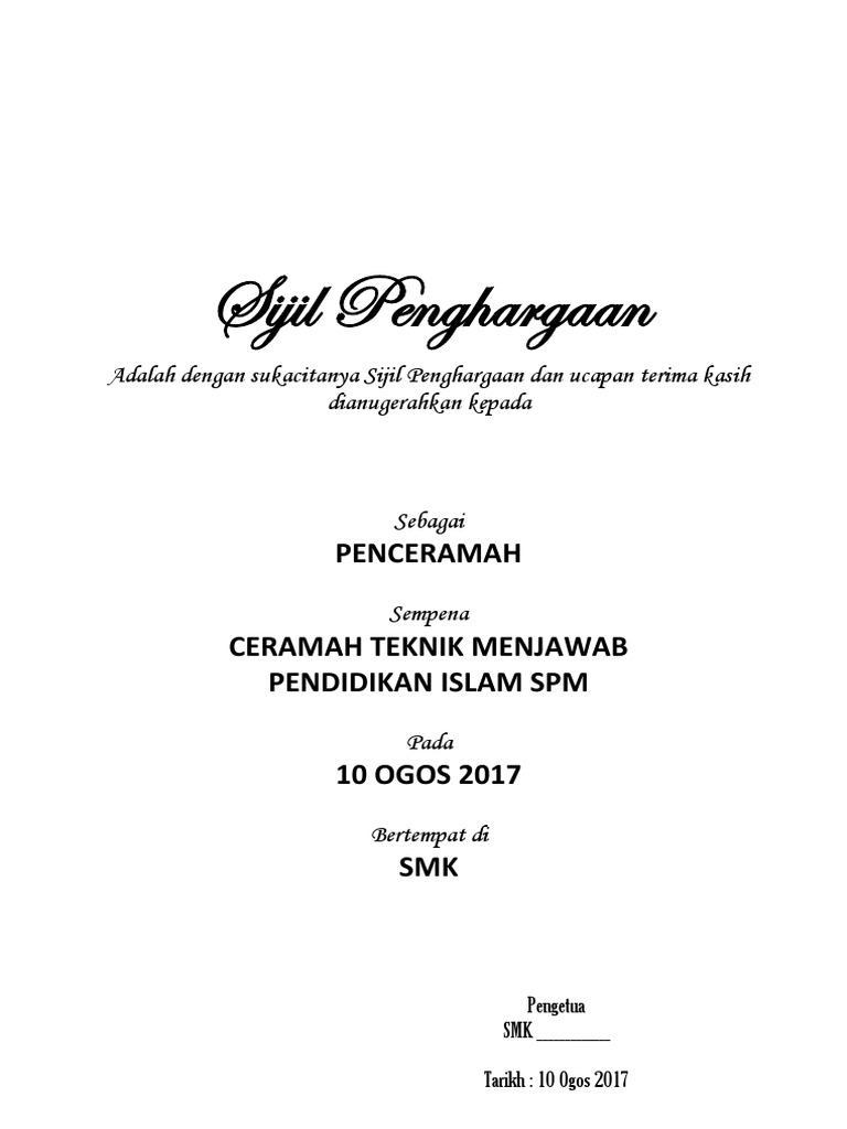 Contoh Sijil Penghargaan Kepada Penceramah - Penceramah haruslah orang dengan ilmu pengetahuan dan wawasan luas atau merupakan pakar yang menguasai bidang dan informasi terkait.. Contoh ucapan hari lahir, hari jadi, takziah, guru, perkahwinan, perpisahan, penghargaan, tahniah, doa selepas solat. The file extension pdf and ranks to the documents category. 0️⃣1️⃣ download file design sijil penghargaan yang boleh diedit disini. Adakah anda mencari templat sijil penghargaan percuma? Contoh surat terima kasih atas sumbangan.