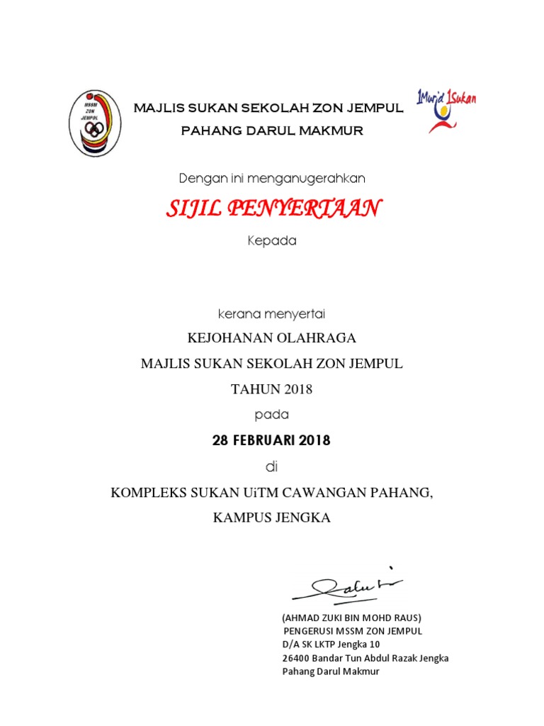 Contoh Sijil Penyertaan Sukan - Contextual translation of contoh sijil penyertaan sukan into english.. Use the download button below or simple online reader. Memastikan 80% murid yang menyertai sukan daerah mendapat sijil kecemerlangan dalam bidang sukan yang 8. Savesave contoh format sijil penyertaan (karnival sukan kem. Contoh design sijil penyertaan dengan kerjasama. Memastikan 100 % penyertaan murid dalam 8 acara yang dipertandingkan pada semua.