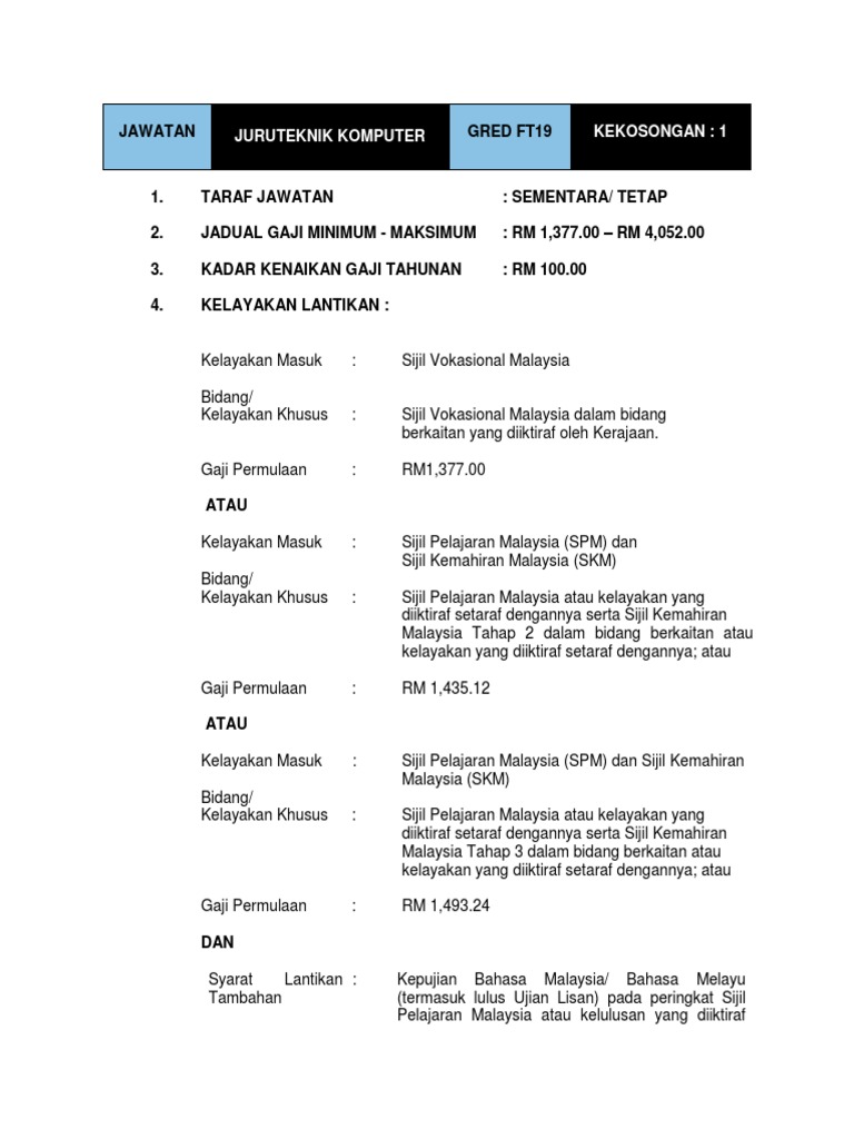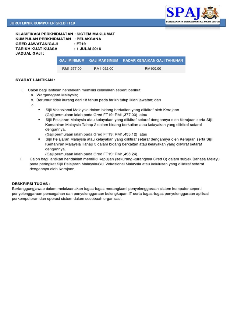 Juruteknik Komputer Gred Ft19 / Kekosongan jawatan pembantu juruteknik komputer gred ft19.. Berikut adalah 15 orang juruteknik komputer yang terlibat dalam kursus ini. Mereka adalah juruteknik daripada sekolah sekolah berikut Zulkefly bin abdul rahim gelaran jawatan : Patuhi prosedur operasi standard (sop), amalkan norma 3w (wash, wear & warn) dan. Juruteknik komputer gred hakiki jawatan :